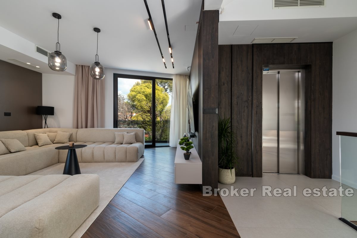 Im ersten Stock befinden sich ein Flur, eine Waschküche, ein Badezimmer, eine Sauna, ein Fitnessraum und ein Ankleidezimmer. Auf derselben Etage befindet sich auch eine geräumige Garage für zwei Fahrzeuge. Eine Innentreppe führt in den zweiten Stock, wo sich drei Schlafzimmer befinden, jedes mit eigenem Badezimmer und Zugang zur Terrasse mit Meerblick. Im obersten Stock gibt es einen offenen Wohnbereich, einen Flur und eine Gästetoilette. Die gesamte Villa ist durch ein Heiz-, Kühl- und Lüftungssystem klimatisiert und verfügt außerdem über eine Fußbodenheizung. Sie wird voll möbliert und mit hochwertigen, maßgefertigten Möbeln ausgestattet verkauft. Es verfügt über einen eigenen Aufzug und bietet neben der Garage auch zwei Außenparkplätze.
